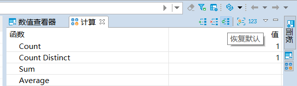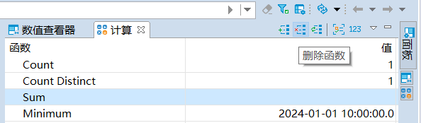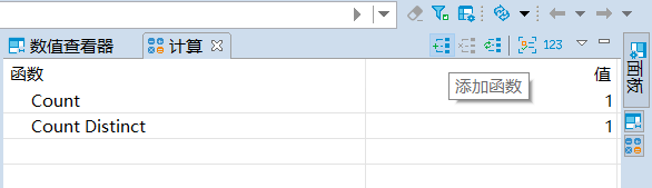 计算面板支持使用函数来计算数据结果。默认情况下,KaiwuDB 开发者中心提供计数(Count)和去重计数(Count Distinct)的计算结果。