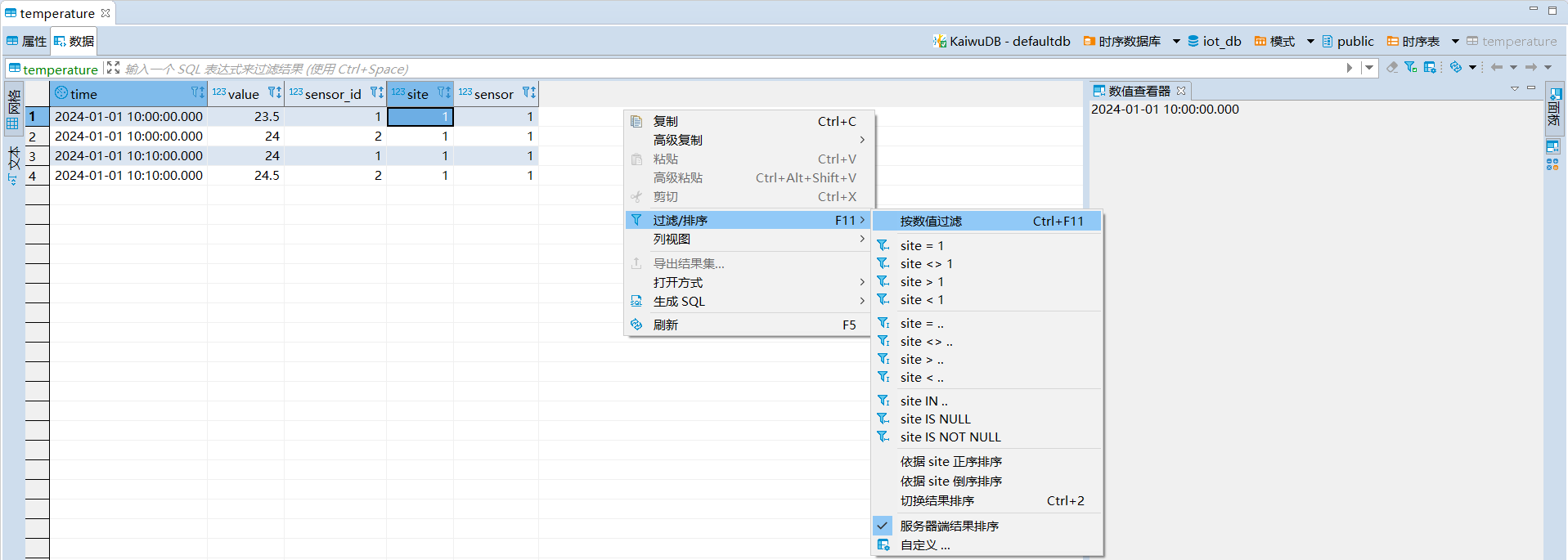 KaiwuDB 开发者中心支持通过结果面板进一步过滤和计算查询结果。