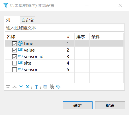 在结果集的排序/过滤设置窗口,选择列,设置自定义参数,然后单击确定。