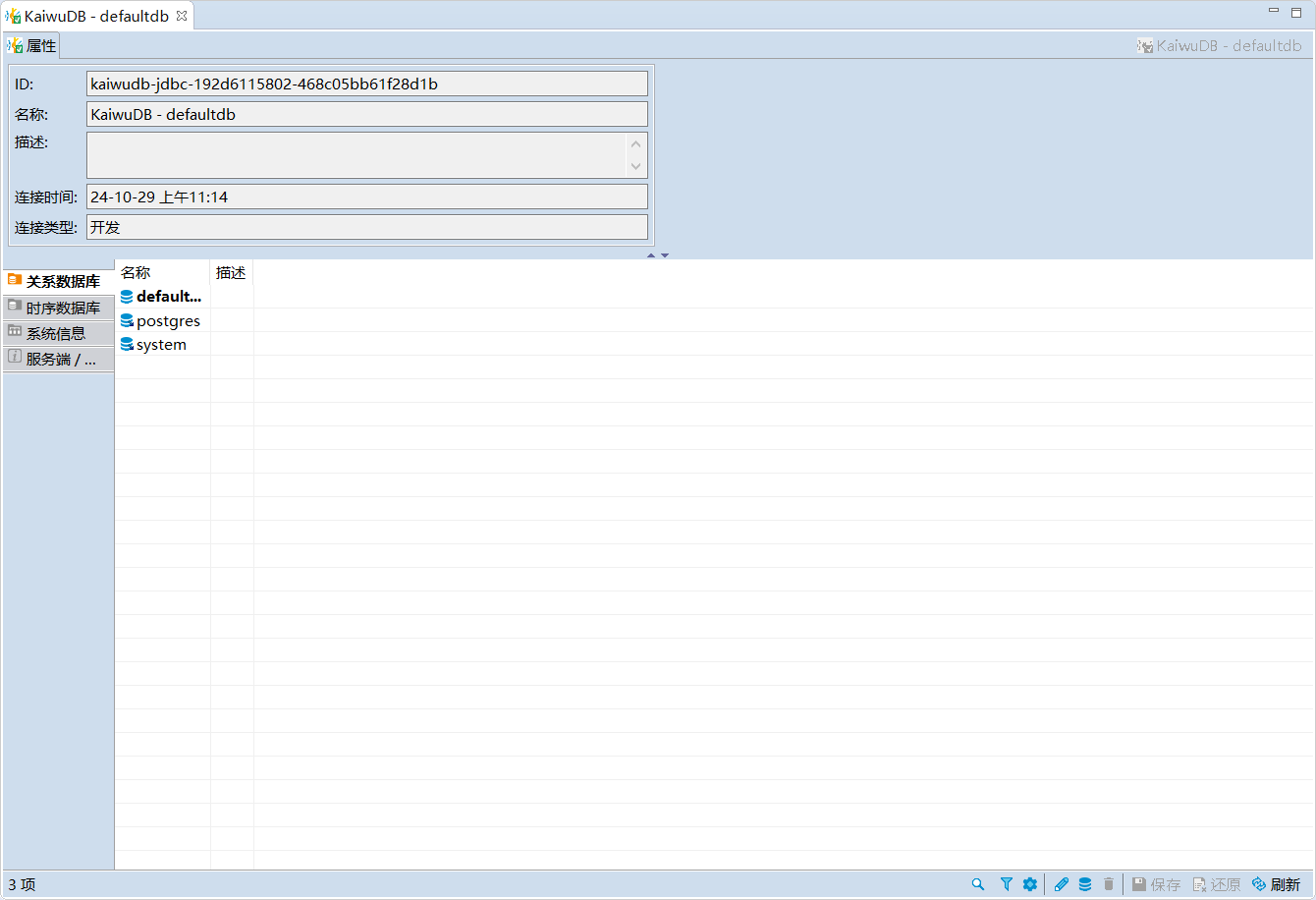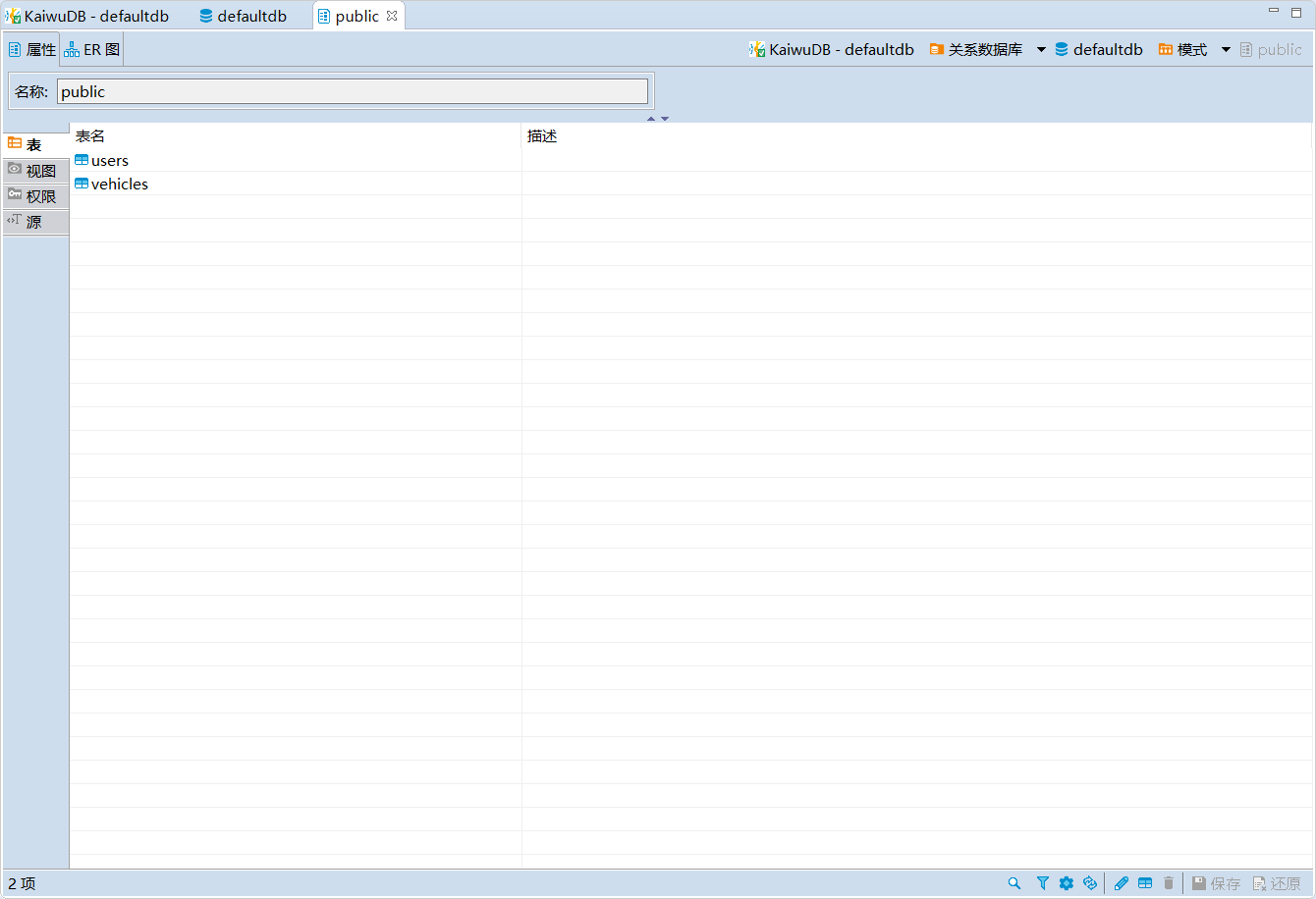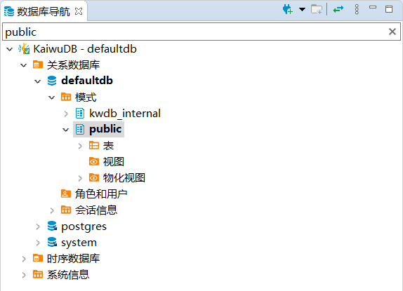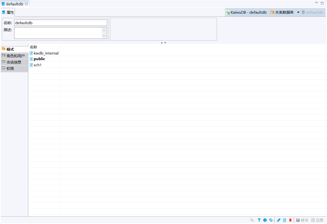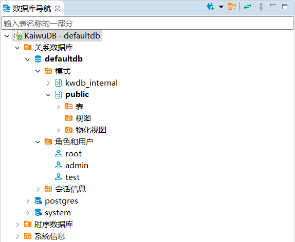 对象 操作 KaiwuDB SQL 编辑器、近期 SQL 编辑器、创建、编辑连接、断开连接、删除、重命名、备份还原时序引擎、刷新等功能。 关系数据库 新建、查看、刷新关系数据库。 时序数据库 新建、查看、刷新时序数据库。 自定义数据库 设为活动对象、新建、编辑、删除、重命名、刷新自定义数据库、创建模式、角色和用户。 模式 新建、查看、刷新模式。 自定义模式 设为活动对象、新建、编辑、删除、刷新自定义模式、显示 ER 图、生成 SQL 语句。 表 新建、查看、刷新表。 自定义表 新建、编辑、编辑数据、在 SQL 控制台中读数据、导出数据、导入数据、生成 SQL 语句、工具、删除等。 视图 新建、查看、刷新视图。 自定义视图 新建、编辑、删除、在 SQL 控制台中读数据、显示 ER 图、导出数据、生成 SQL 语句等。 物化视图 新建、查看、刷新物化视图。 自定义物化视图 新建、删除、刷新自定义物化视图等。 存储过程 新建、查看、刷新物存储过程。 自定义存储过程 新建、执行、删除、自定义存储过程等。 角色和用户 新建、查看、刷新角色和用户。 自定义角色和用户 编辑、删除、刷新、启用或禁用自定义角色或用户、用户管理等。 会话信息 查看、刷新会话信息。 系统信息 查看、刷新系统信息。 审计策略 创建、查看和刷新审计策略。 密级标记 创建、查看和刷新密级、范围和标记。 说明