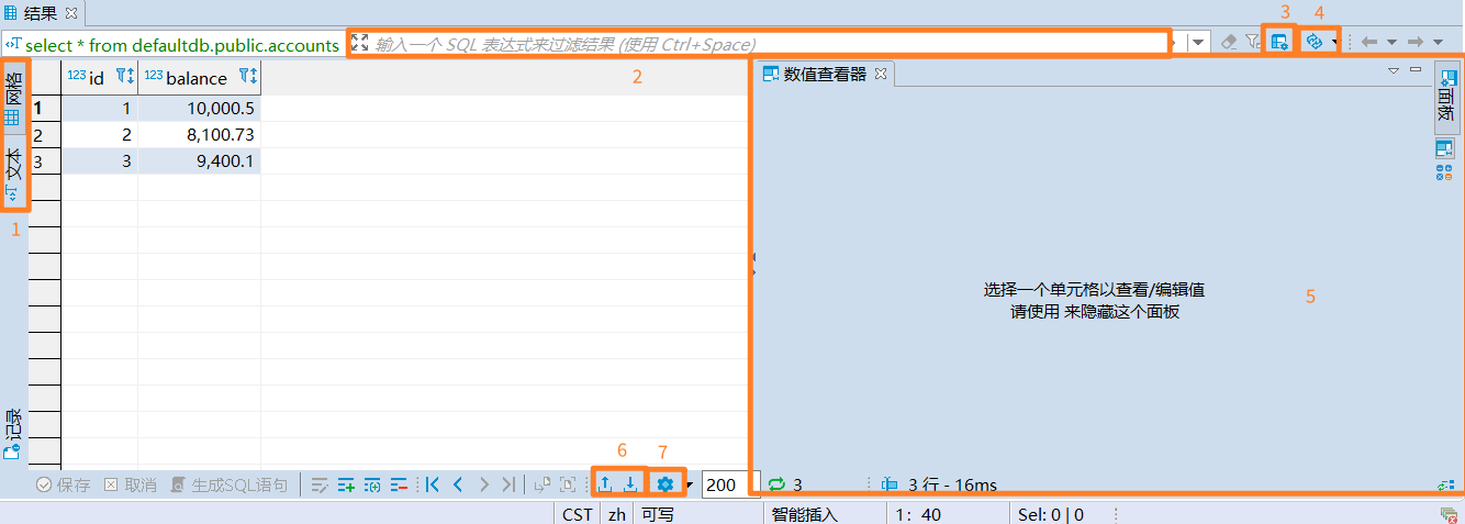 状态栏显示当前时区、语言、读写状态、数据插入模式、当前行数等信息。