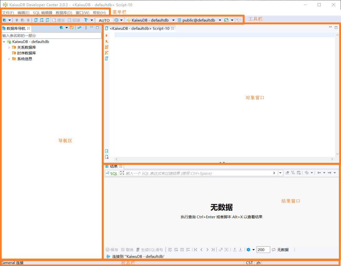 KaiwuDB 开发者中心窗口包含菜单栏、工具栏、导航区、对象窗口、结果窗口以及状态栏。