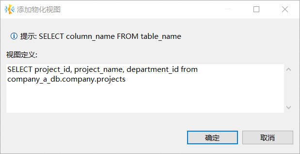 在添加物化视图对话框,写入想要查询的 SQL 语句,然后单击确定。系统将自动创建名为