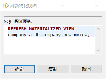 在数据库导航区,右键单击需要刷新的物化视图,然后选择工具 > 刷新物化视图 。