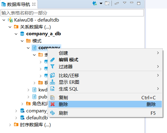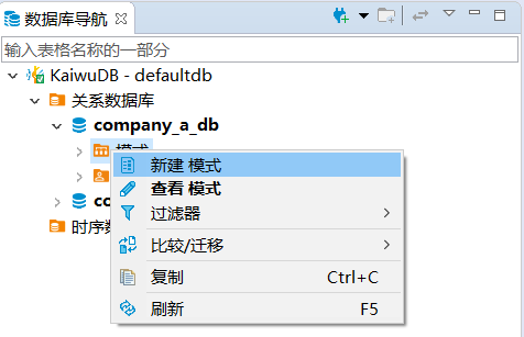 KaiwuDB 开发者中心支持创建、编辑、查看、删除模式。