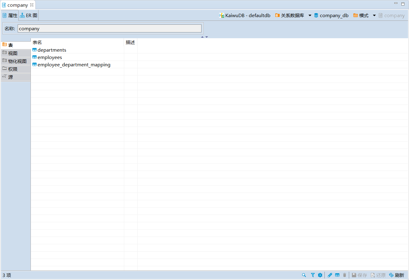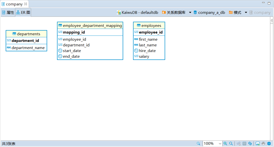 在数据库导航区,双击需要查看的模式,即可在对象窗口查看模式的属性和 ER 图信息。