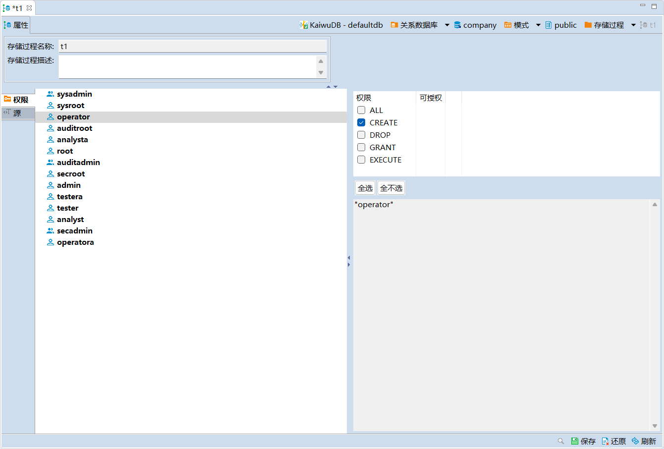 admin角色的成员或者拥有目标存储过程的 CREATE 权限。默认情况下,root用户属于admin角色。 - 三权分立模式下,用户是