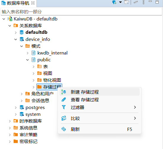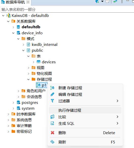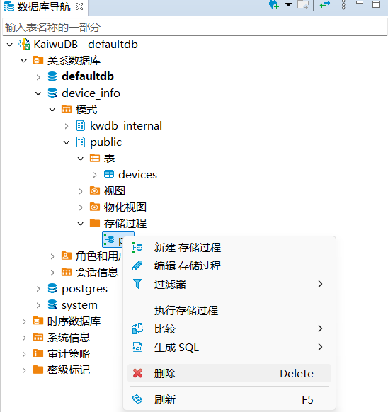 KaiwuDB 开发者中心支持存储过程的创建、调用、修改、查看和删除。