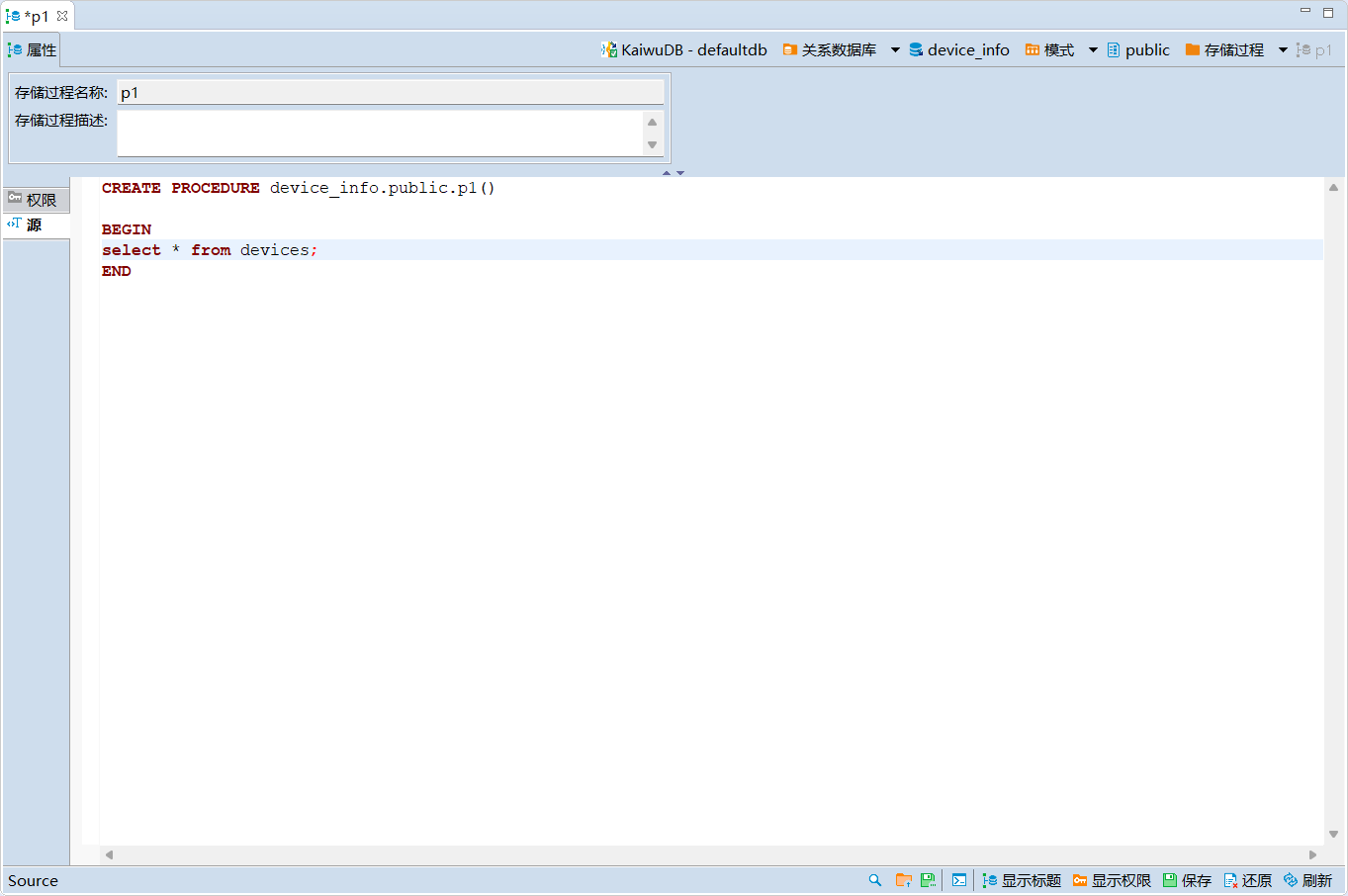 在存储过程的源页签,编辑存储过程函数体,然后单击页面右下方的保存按钮。