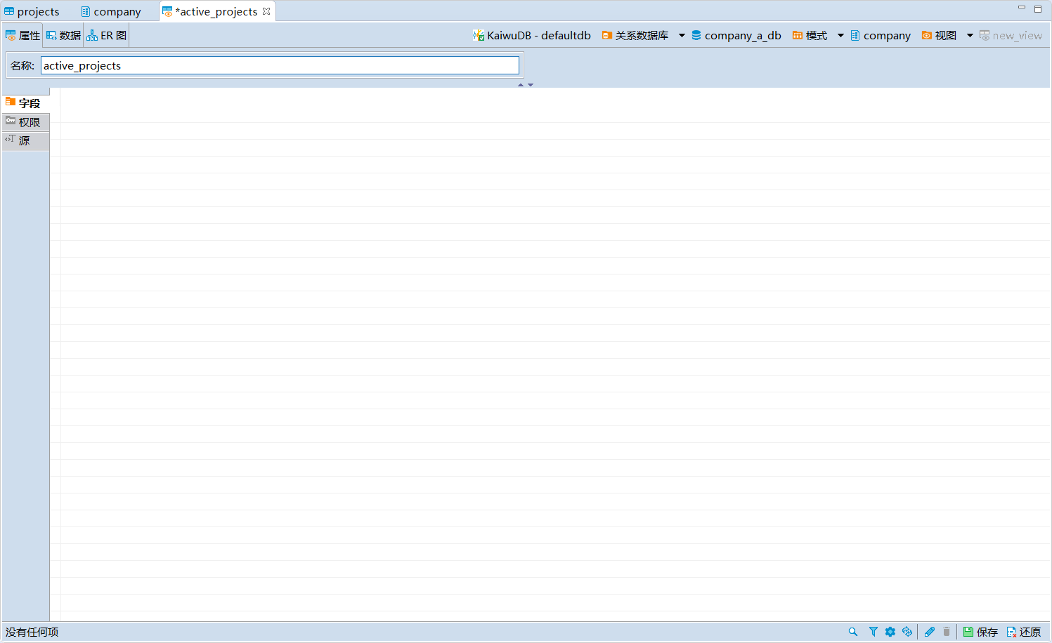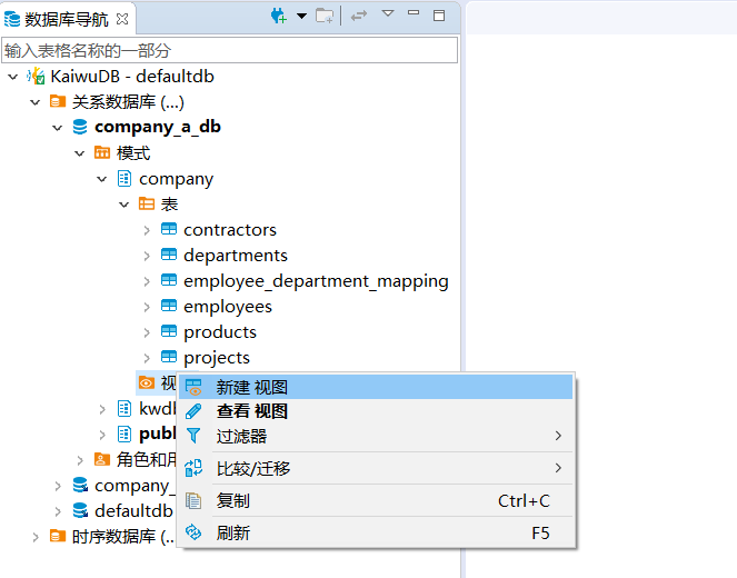 KaiwuDB 开发者中心支持创建、编辑、删除、重命名视图,向视图中写入数据或从视图中读取数据、查看视图的 ER 图以及为视图生成 SQL 语句。