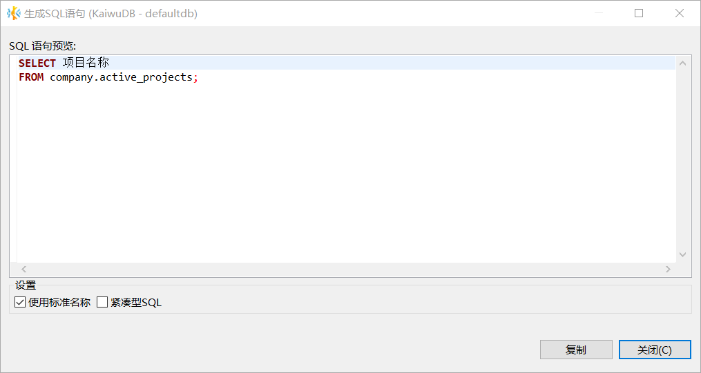 在生成 SQL 语句窗口,选择是否使用标准名称和紧凑型 SQL,然后单击复制或关闭。