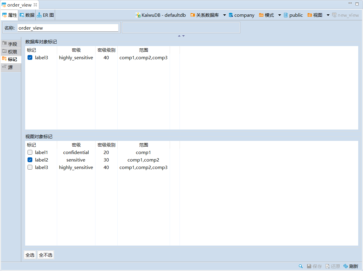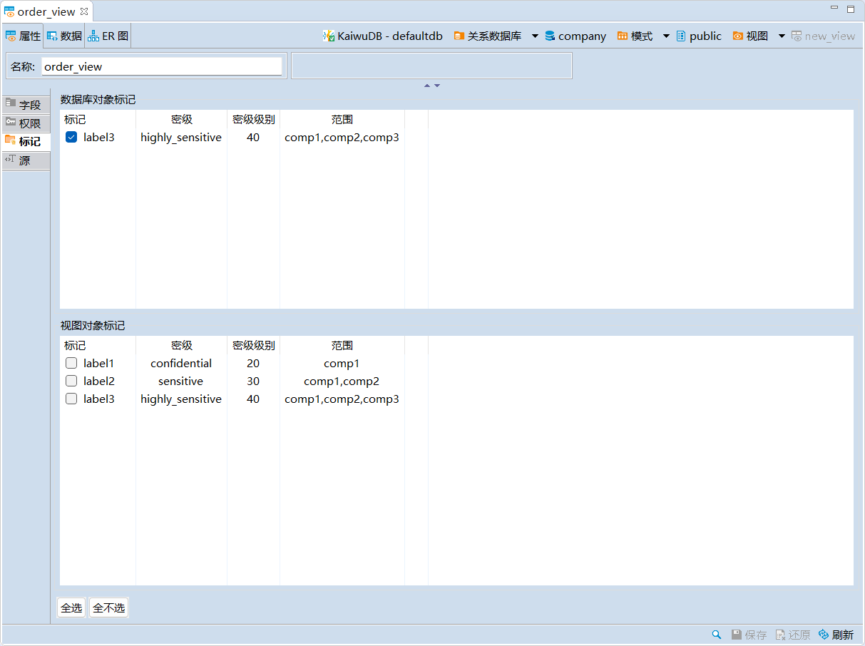 - 将标记应用于客体时,表的密级不高于库的密级,并且表的范围是库的范围的子集。