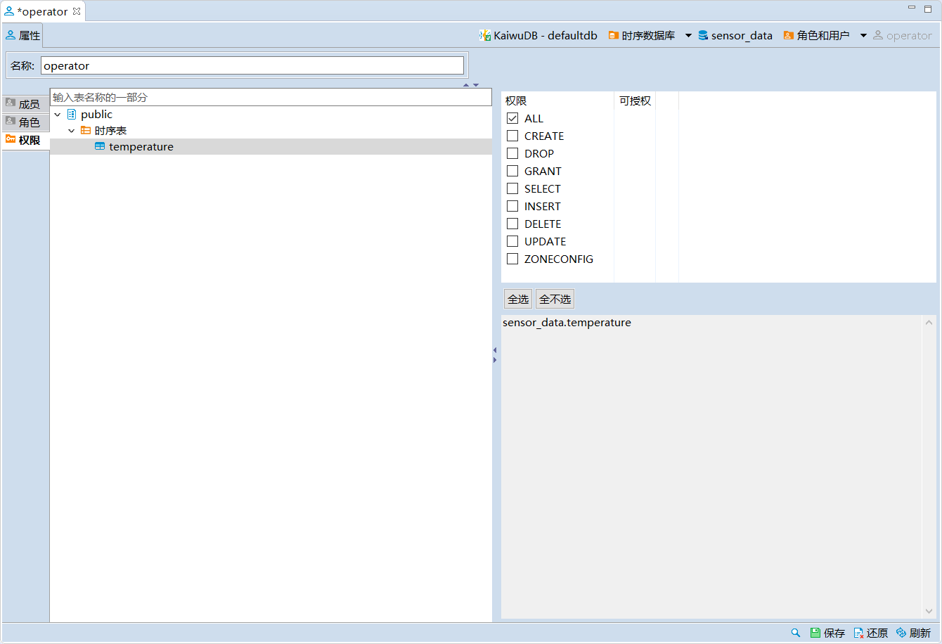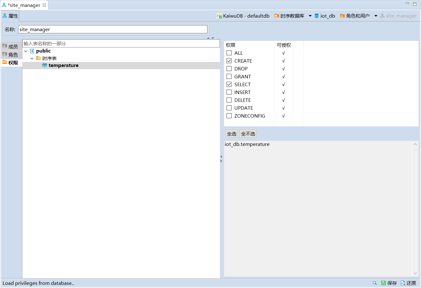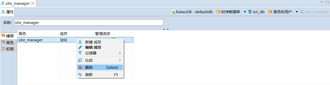 KaiwuDB 开发者中心支持创建、删除角色或用户,为角色或用户添加成员、删除成员、赋予权限、撤销权限等操作。