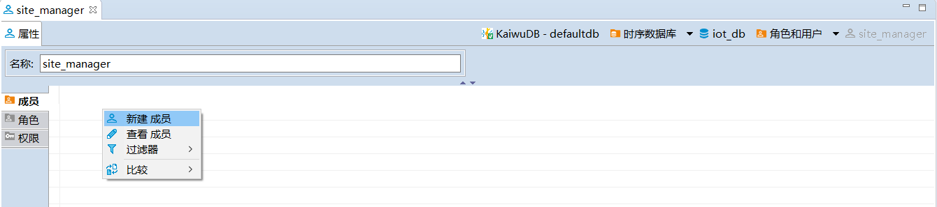 KaiwuDB 开发者中心支持为角色或用户添加成员。角色或用户的所有权限都被其成员继承。如需为管理员角色添加成员,用户必须是具有 WITH ADMIN OPTION 权限的管理员角色。