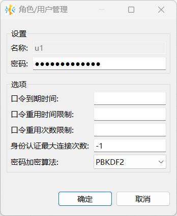 在角色或用户管理窗口,根据需要修改用户密码、口令到期时间、口令重用时间限制、口令重用次数限制、身份认证最大连接次数和密码加密算法,然后单击确定。
