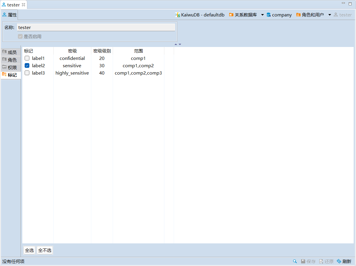 admin管理员、系统管理员、安全管理员和审计管理员等用户主体,只能应用于新创建的普通用户。 - 将多个标记应用于主体时,多个标记必须具备相同的密级,且范围值采取并集。