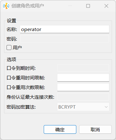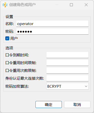 在创建角色或用户窗口,设置名称,选择是否勾选用户。如果不勾选,创建角色,勾选后,创建用户。根据需要设置口令到期时间、口令重用时间限制、口令重用次数限制、身份认证最大连接次数和密码加密算法。其中,