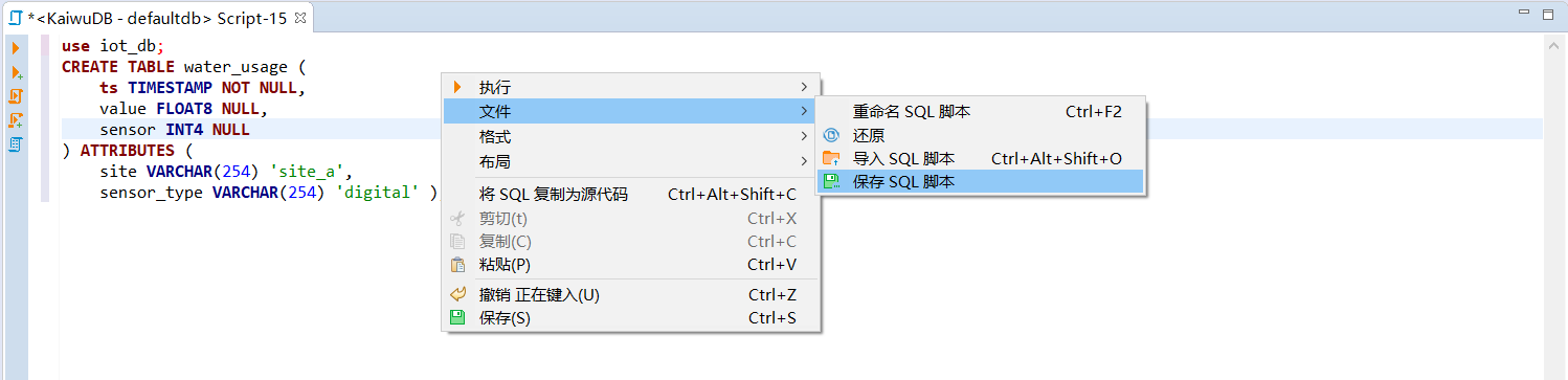 在 SQL 编辑器页面,右键单击页面空白处,然后从右键菜单中选择文件 > 保存 SQL 脚本。