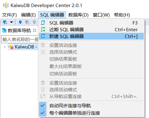单击菜单栏中的 SQL 编辑器,然后选择新建 SQL 编辑器。