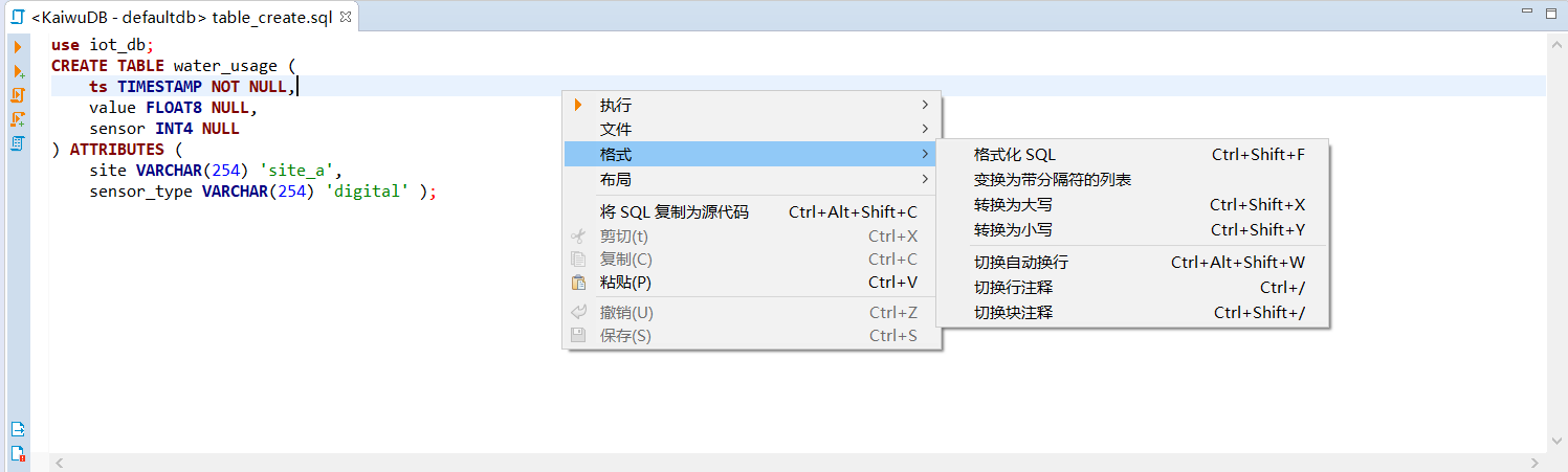 在 SQL 编辑器页面,右键单击页面空白处,然后从右键菜单中选择格式,即可对选中的 SQL 语句进行相关操作。