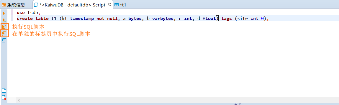 单击左侧的执行 SQL 脚本按钮或在单独的标签页中执行 SQL 脚本按钮。
