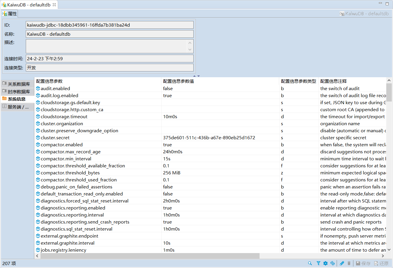 双击系统信息,查看 KaiwuDB 所有的配置参数、参数值和参数类型。