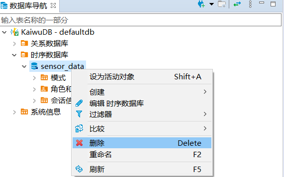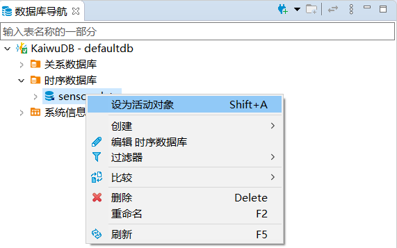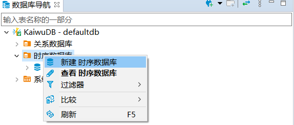 在数据库导航区,右键单击时序数据库,然后选择新建时序数据库。