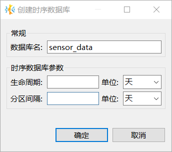 在创建时序数据库窗口,填写数据库名称,根据需要设置数据库生命周期,然后单击确定。默认情况下,数据库的生命周期为