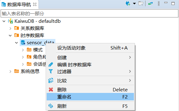 在数据库导航区,双击需要修改的数据库,或者右键单击需要修改的数据库,然后选择编辑时序数据库。