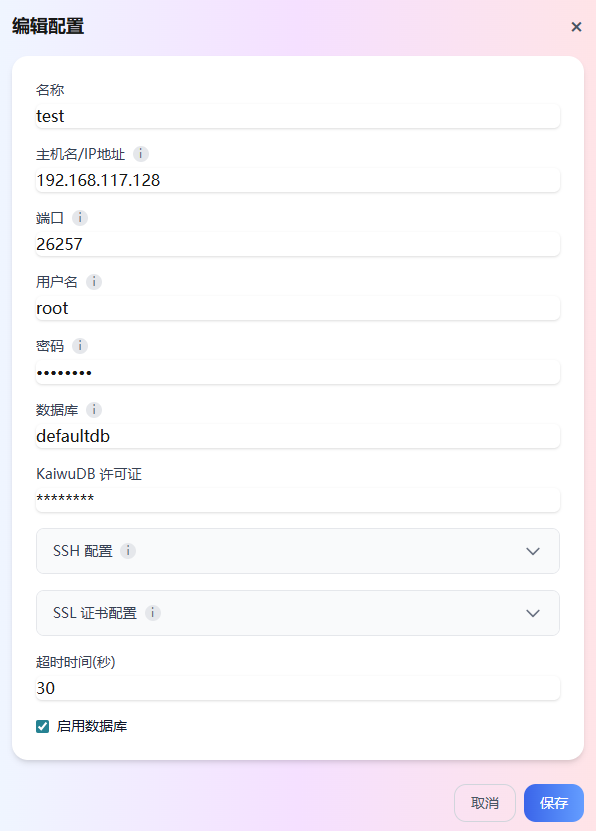 名称:数据库的配置名称,便于后续查询和管理数据库。主机名/IP 地址:KaiwuDB 数据库所在主机的 IP 地址。端口:KaiwuDB 数据库的连接端口。用户名:KaiwuDB 数据库的登录用户名。密码:KaiwuDB 数据库的登录密码,非安全模式部署时无需填写。数据库:待连接的数据库名称,默认为defaultdb。KaiwuDB 许可证:可选参数,KaiwuDB 许可证。SSH 配置:可选参数,通过 KAT 部署或管理远程节点时,需配置目标主机的 SSH 端口、用户名和密码。SSL 证书配置:可选参数,使用证书登录数据库时,需配置客户端证书、私钥和 CA 证书。超时时间:设置数据库连接的超时时间(单位:秒)。默认为30s。启用数据库:配置是否启用该数据库连接。勾选后,系统启用该数据库。通过 KAT 部署或连接 KaiwuDB 时,需确保该选项已启用。