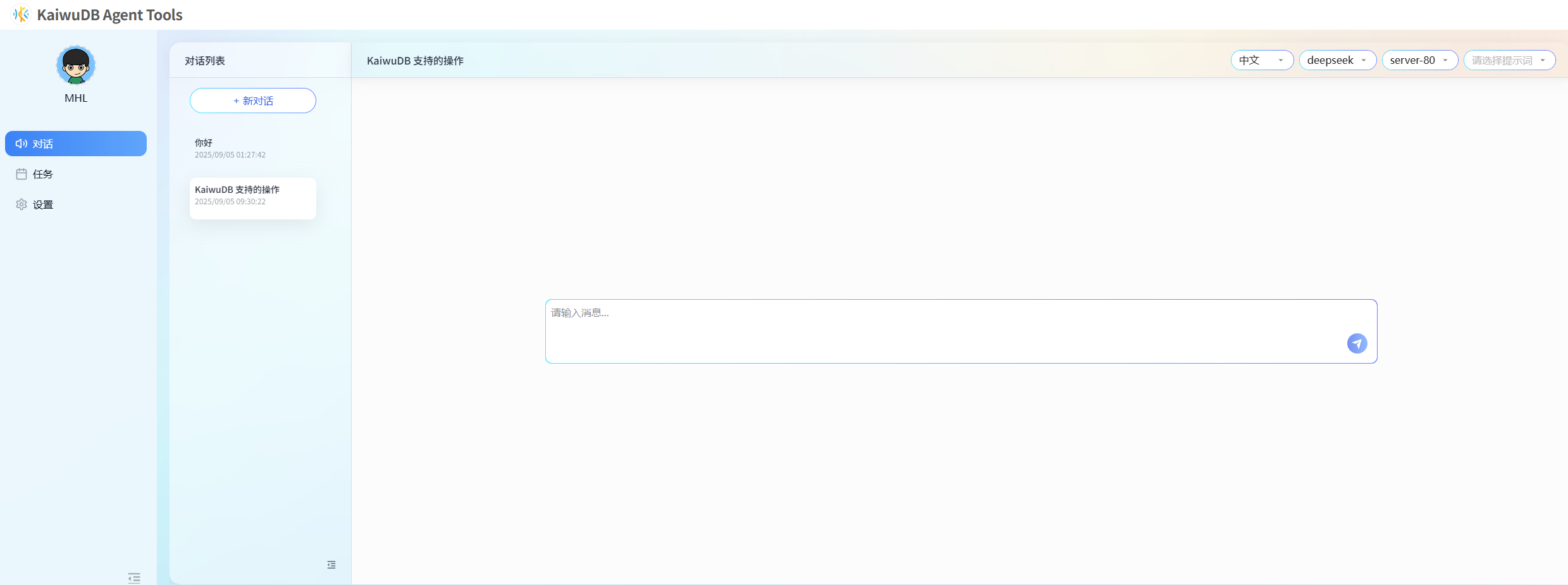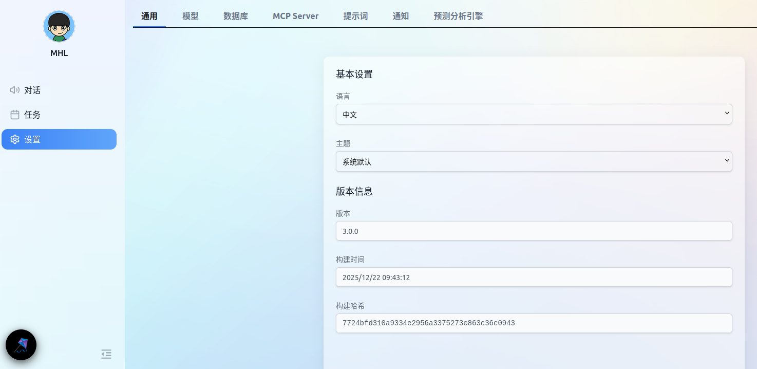 左侧导航栏:提供对话、任务和设置三个主要页面的入口。