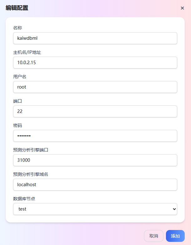 单击添加配置。然后在弹出的对话框中,添加 KaiwuDB 预测分析引擎信息。