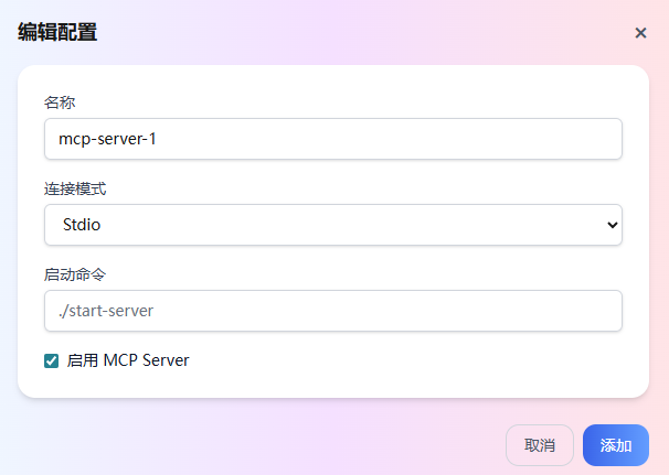 单击添加配置。然后在弹出的对话框中,添加 MCP Server 信息。