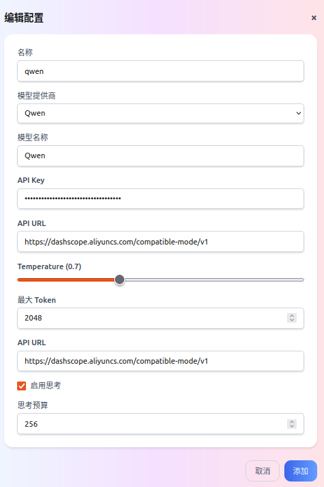 名称:模型的配置名称,便于后续查询和查找管理模型。模型供应商:模型供应商的名称。支持 OpenAI、Anthropic、Google、Qwen 和自定义选项。默认为 OpenAI。模型名称:模型名称。API Key:模型的 API 密钥。API URL:模型的 API 基础 URL。该参数只适用于自定义模型供应商。Temperature:模型的温度值。最大 Token:模型的最大令牌数。启用思考:是否启用思考模型。该参数只适用于已配置思考模型的模型供应商。思考预算:思考模型使用的思考预算。该参数只适用于已配置思考模型的模型供应商。
