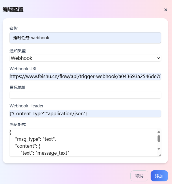 名称:通知的名称。便于后续查询和管理通知。通知类型:通知的类型,支持 Webhook 和 Email 两种形式。Webhook URL:通知接收方的 URL 地址。目标地址:通知接收方的 Email 地址。Webhook Header:Webhook 请求头部。消息格式:通知的格式。