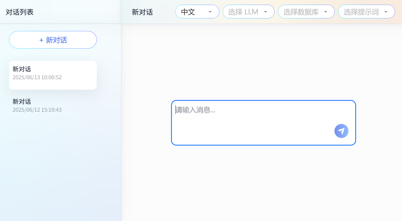 在右侧消息交互页面,根据需要选择语言、LLM 模型、以及可选的数据库和提示词(需提前配置后方可选择),输入要查询的内容,然后单击发送按钮。