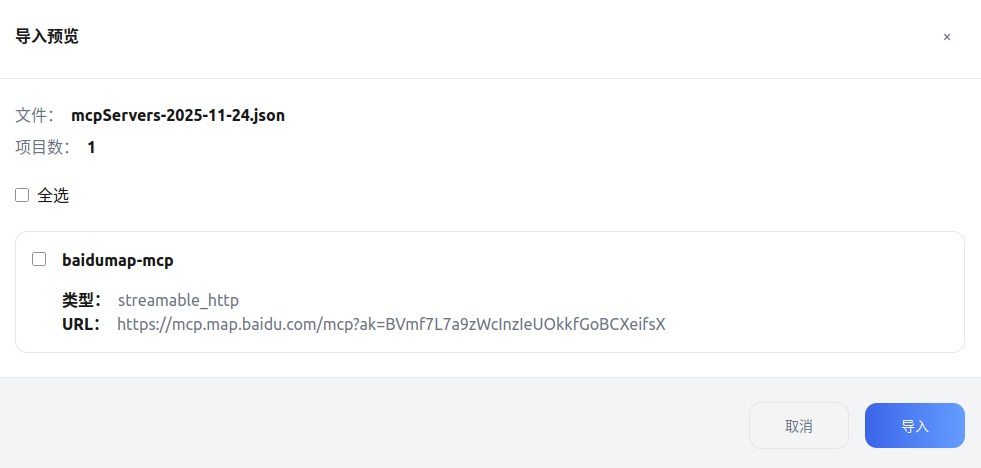 - 如果待导入的 MCP Server 配置文件为空或者格式错误,则导入失败并返回报错。
