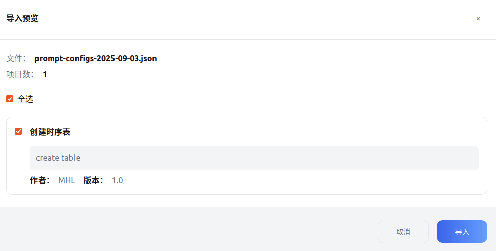 - 导入提示词时,系统仅校验配置格式与字段完整性,不验证配置项的业务逻辑准确性。