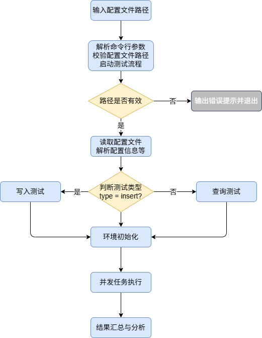 解析与校验:KaiwuDB Benchmark 解析命令行参数,校验配置文件路径并启动测试流程。