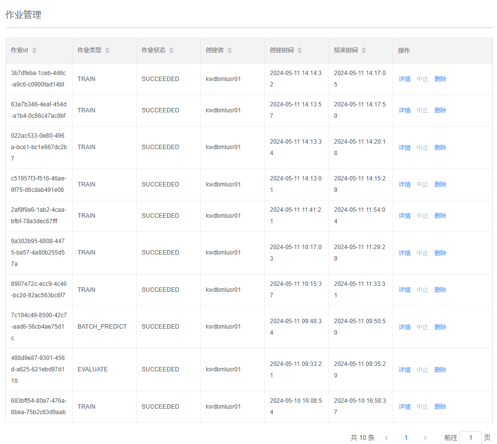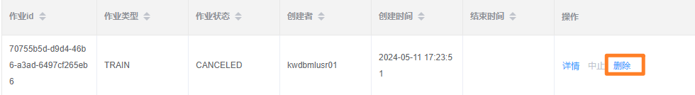在作业管理页面,单击待查看作业对应的详情选项,即可查看作业的 ID、类型、设置、错误等信息。