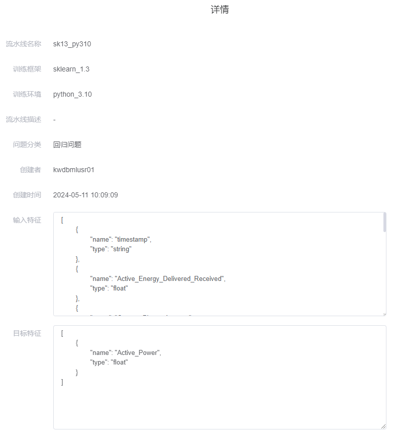 - TensorFlow:2.8 和 2.9- 运行环境 训练流水线的运行环境及版本,支持以下运行环境。目前,支持的环境版本包括:Python 3.8、3.9 和 3.10。 - 模型特征 训练流水线的输入特征列信息,包括列名和数据类型。特征列名和数据类型以 JSON 数组的形式定义。支持的输入特征类型包括 STRING、INT、FLOAT。单击格式化 JSON,即可优化 JSON 格式。 [{"name": "timestamp", "type": "string"}, {"name": "Active_Energy_Delivered_Received", "type": "float"}, {"name": "Current_Phase_Average", "type": "float"}, {"name": "Performance_Ratio", "type": "float"}, {"name": "Wind_Speed", "type": "float"}, {"name": "Weather_Temperature_Celsius", "type": "float"}, {"name": "Weather_Relative_Humidity", "type": "float"}, {"name": "Global_Horizontal_Radiation", "type": "float"}, {"name": "Diffuse_Horizontal_Radiation", "type": "float"}, {"name": "Wind_Direction", "type": "float"}, {"name": "Weather_Daily_Rainfall", "type": "float"}, {"name": "Radiation_Global_Tilted", "type": "float"}, {"name": "Radiation_Diffuse_Tilted", "type": "float"}]输出特征 训练流水线的输出目标列信息,包括列名和数据类型。特征列名和数据类型以 JSON 数组的形式定义。支持的输出目标列类型包括 STRING、INT、FLOAT。单击格式化 JSON,即可优化 JSON 格式。 [{"name": "Active_Power", "type": "float"}]流水线文件 - 支持上传打包好的 ZIP 压缩包或者上传多个模型文件。