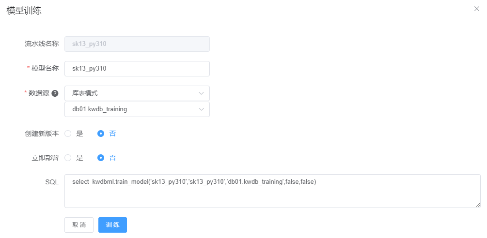 在模型训练窗口,设置模型名称、数据源,选择是否创建模型新版本以及是否立即部署。