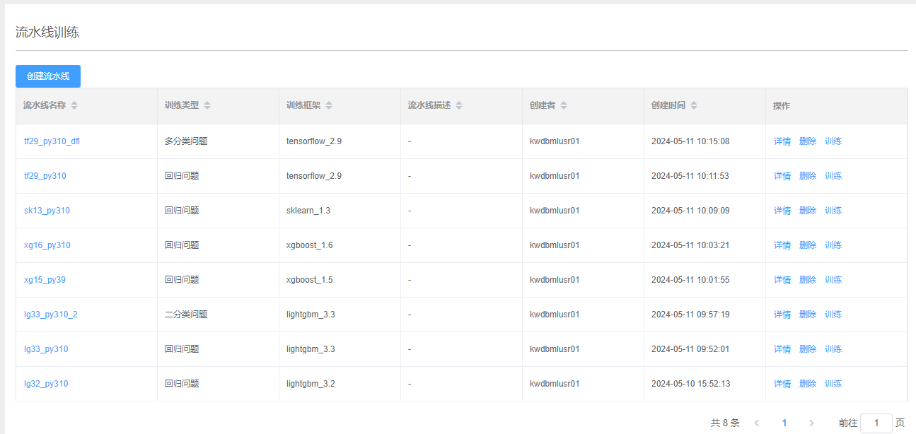 流水线训练页面列出所有导入的训练流水线的基本信息。