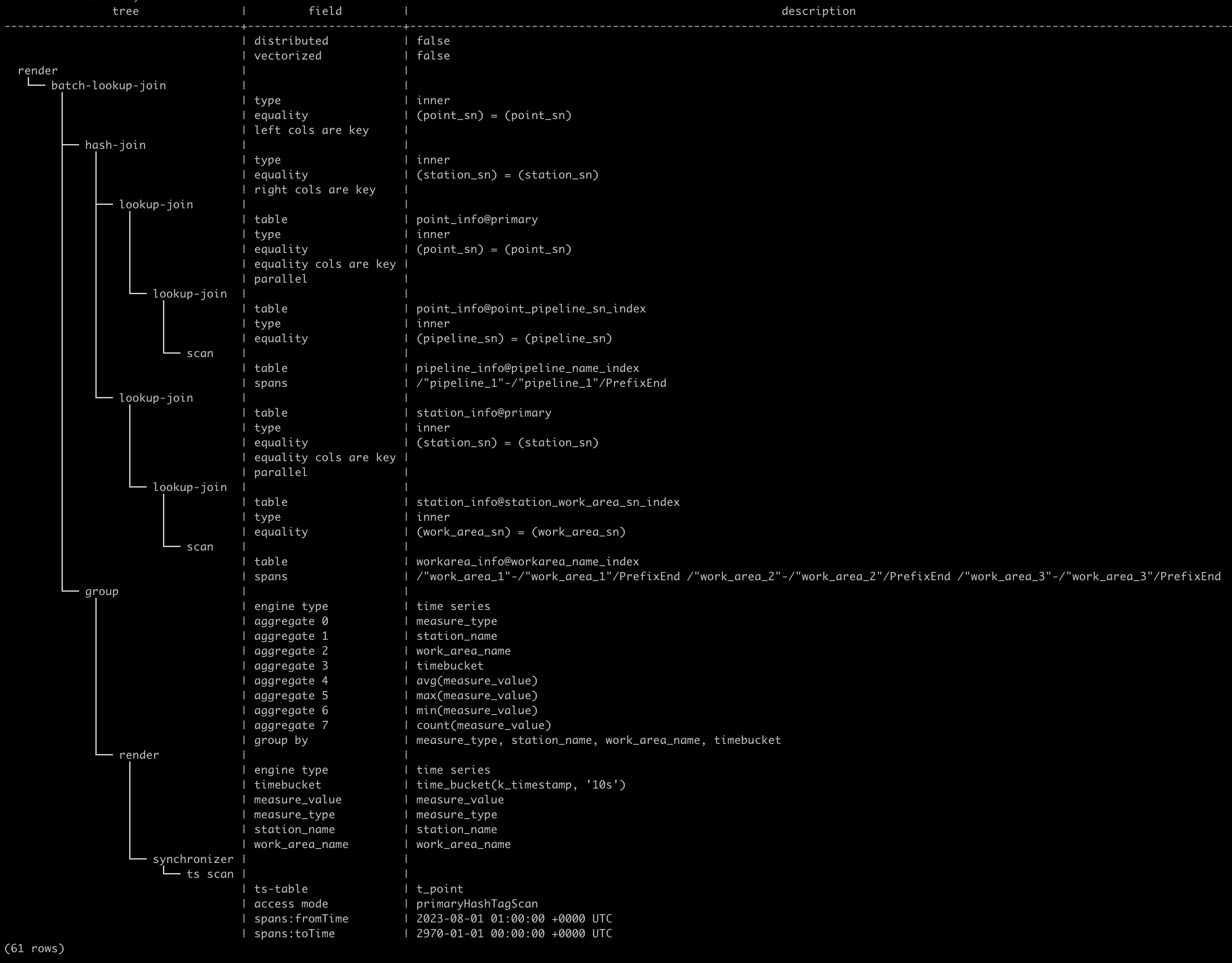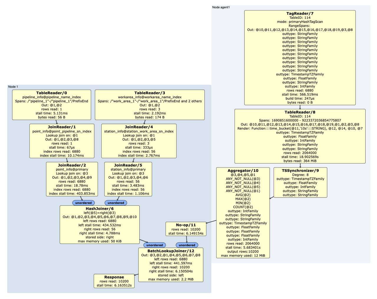 EXPLAIN ANALYZE 语句显示更加详细的执行信息,包括连接类型、等值连接列的具体匹配、ON 条件表达式等。除了基本的连接类型和条件外,系统还会输出左右表连接列的详细配置。如果连接操作中存在列合并的情况,EXPLAIN ANALYZE 语句还会输出合并的列数。EXPLAIN ANALYZE 语句模拟输出如下所示。其中,TagReader7 中的 mode,即 EXPLAIN 语句得到的查询计划中 ts-scan 节点中的 access mode,显示为 primaryHashTagScan。当存在 BatchlookupJoiner 时,该算子会格外显示 build time,表示创建多模查询的 Hash 索引所花费的时间。此外,BatchlookupJoiner/12 对应上述查询计划中的 BatchLookupJoinNode 节点的新增 join 算子,其左侧数据流为关系型数据,右侧为时序引擎执行结果返回数据。