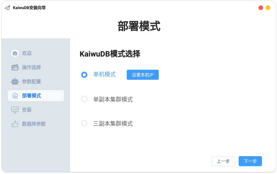 在部署模式页面,勾选单机模式,点击设置本机 IP,完成节点 IP 地址后,点击下一步,系统将自动跳转至安装页面。