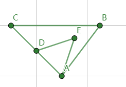 'POLYGON((1.0 1.0, 2.0 2.0, 3.0 2.0, 1.0 1.0))'表示包含一个三角形的面。第⼀层括号表示整个面,第⼆层括号包括构成三角形的点的坐标。'POLYGON ((3.0 2.0, 4.5 4.0, 1.0 4.0, 3.0 2.0), (2.0 3.0, 3.5 3.5, 3.0 2.0, 2.0 3.0))'表示含有内部嵌套三角形的面。第一层括号表示整个面,第二层中,第一个括号表示下图 A、B、C 点组成的三角形,第二个括号表示由 D、E、A 点组成的三角形孔洞。