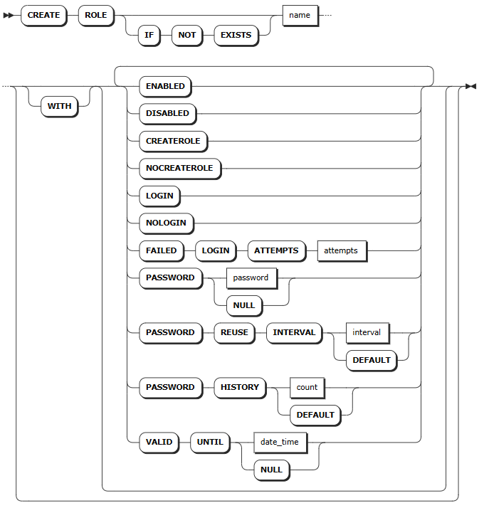 VALID UNTIL <date_time> | 设置密码有效期,也支持使用 NULL 值。支持 timestamp 格式。到达指定日期或时间后,密码失效。设置时需使用单引号(')将密码有效期括起来。在登录 KaiwuDB 数据库时,用户可以在终端上查看该角色的密码到期时间。有关如何查看密码有效期的详细信息,参见查看密码有效期。默认情况下,创建角色时不设置该选项。 |