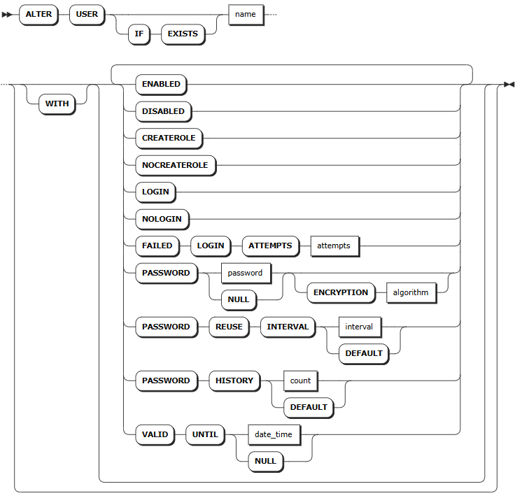 IF EXISTS | 可选关键字。当使用 IF EXISTS 关键字时,如果目标用户存在,系统修改目标用户。如果目标用户不存在,系统修改用户失败,但不会报错。当未使用 IF EXISTS 关键字时,如果目标用户存在,系统修改用户。如果目标用户不存在,系统报错,提示目标用户不存在。 |