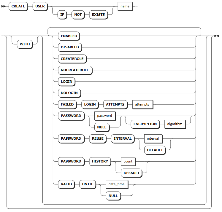 CREATE USER 语句用于创建新用户,并为新用户设置一个或多个选项,例如创建角色、设置登录密码等。默认情况下,新用户具有登录选项。每条语句只支持创建一个用户。三权分立模式下,新创建的用户,如果被授予业务数据的权限,或者作为成员加入其他普通角色,或者作为角色添加其他普通用户作为其成员,则该用户为普通用户。