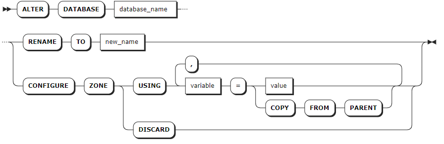 rdb数据库重命名为relationaldb。-- 1. 查看所有数据库。 SHOW DATABASES; database_name|engine_type -------------+----------- defaultdb |RELATIONAL postgres |RELATIONAL rdb |RELATIONAL system |RELATIONAL tsdb |TIME SERIES (5 rows) -- 2. 重命名数据库。 ALTER DATABASE rdb RENAME TO relationaldb; ALTER DATABASE -- 3. 查看所有数据库。 SHOW DATABASES; database_name|engine_type -------------+----------- defaultdb |RELATIONAL postgres |RELATIONAL relationaldb |RELATIONAL system |RELATIONAL tsdb |TIME SERIES (5 rows)修改数据库区域配置。
